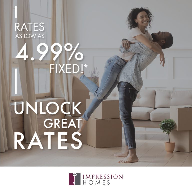 "*“Rates as low as 4.99% Fixed” is valid for new contracts accepted between 10/18/2025 through 12/31/2025 on select completed inventory homes that close and fund on or before the contracted close date. The 4.99% Fixed Rate is based on APR of 5.386%. Other financing options are available. All financing based on FHA/VA/USDA loans and only valid for customer using Impression Homes preferred lender, IH Mortgage. Offer subject to credit approval and only qualified borrowers meeting criteria will be eligible. Automated underwriting approval required. **Additional closing cost amounts, if needed, are subject on the structure of the loan buyer chooses. Any unused amounts that cannot be applied will be forfeited. Additional savings might be available for specific homes and amounts will vary; these additional savings are not dependent on using IH Mortgage. This offer is subject to change or be discontinued at any time without prior notice as well as pricing and home information. See Sales Consultant for full details and community specific information. Inventory homes are sold “as-is” and any images shown are for representation purposes only. 2025 Impression Homes. All Rights Reserved. 10/20/2025