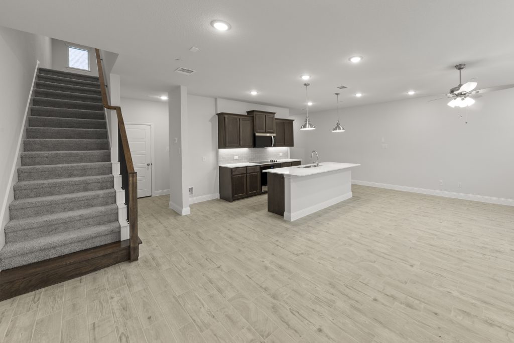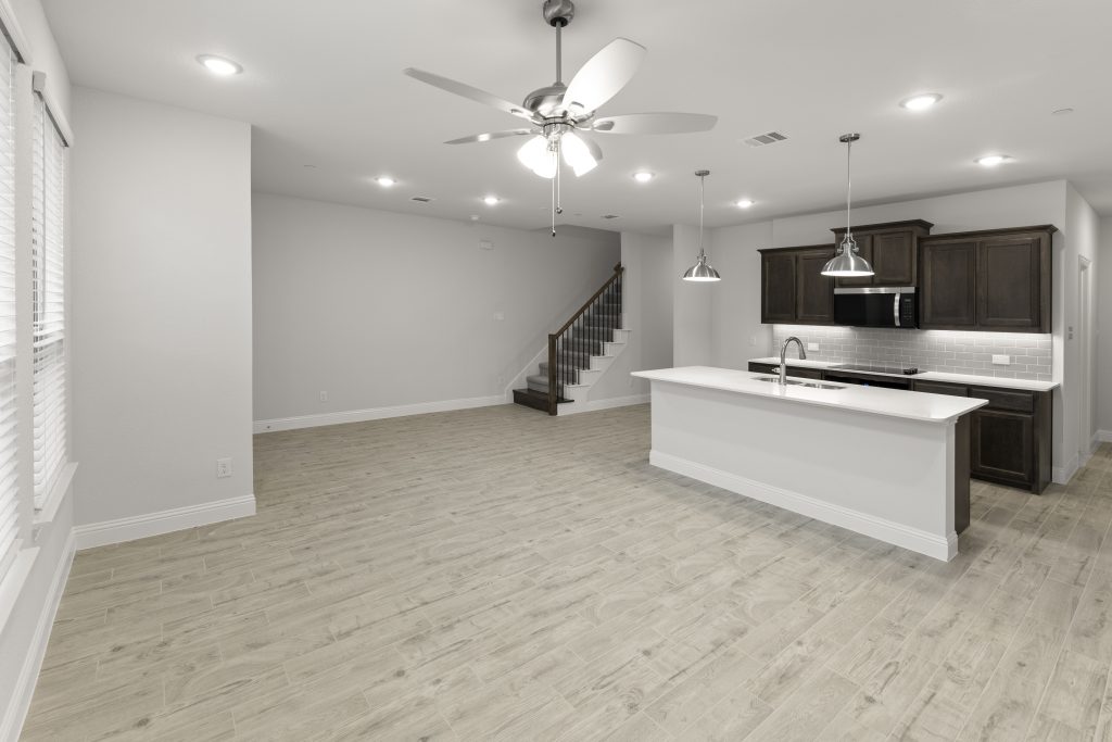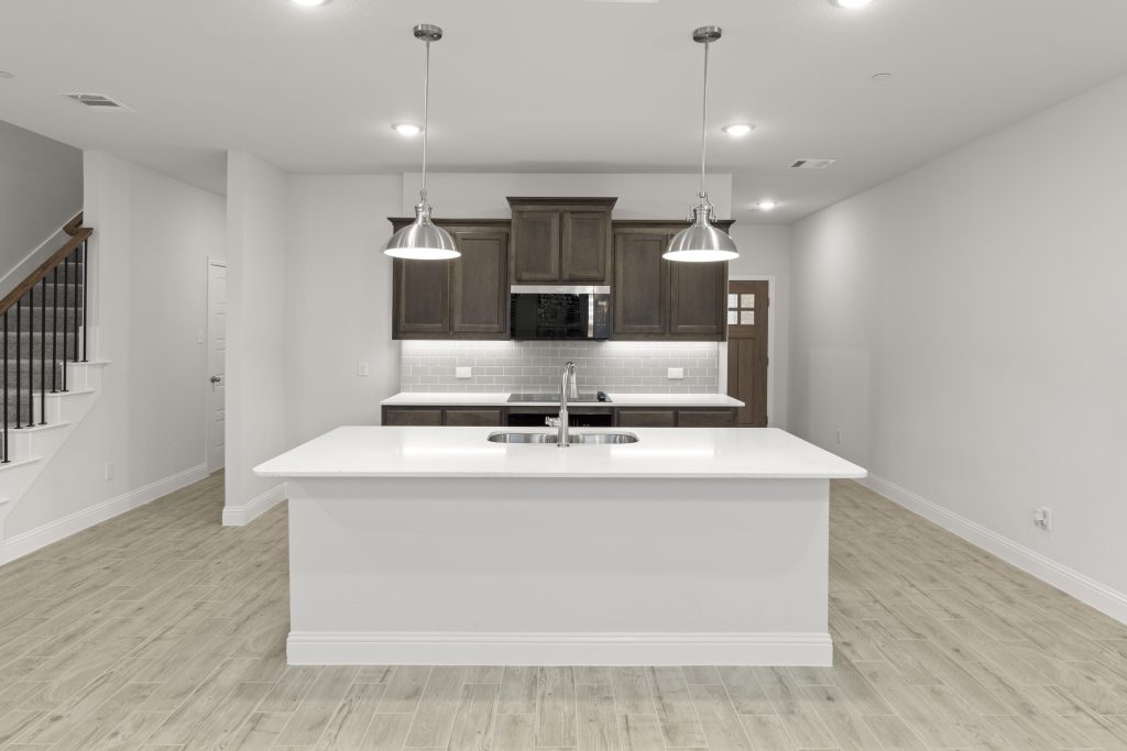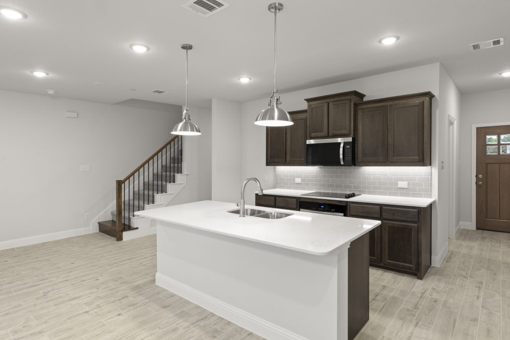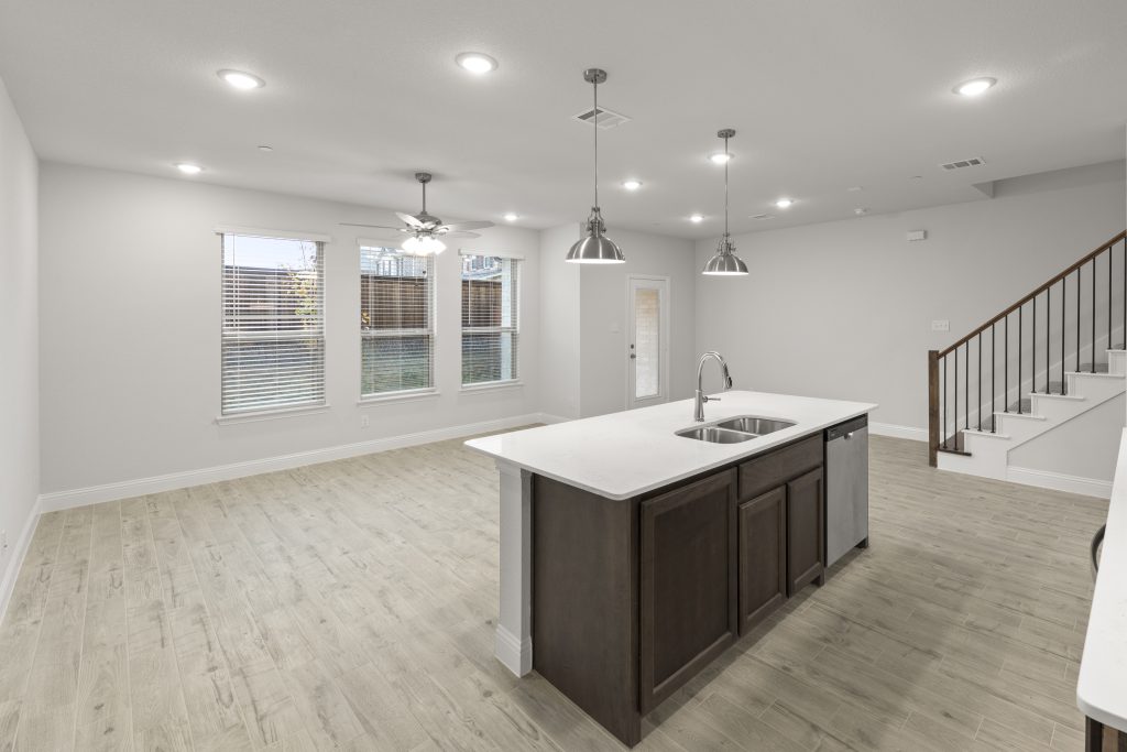 Luxury townhome living in Dallas, TX. Experience open concept living at its best as the California kitchen seamlessly opens to the generously sized family and dining rooms. Conveniently located, a downstairs powder room is appreciated for owners and guests alike.  Upstairs, you’ll also find two secondary bedrooms, a secondary bath, a loft area, utility room and private owner’s suite offering dual sink vanity, oversized shower and massive walk-in closet.