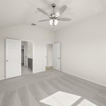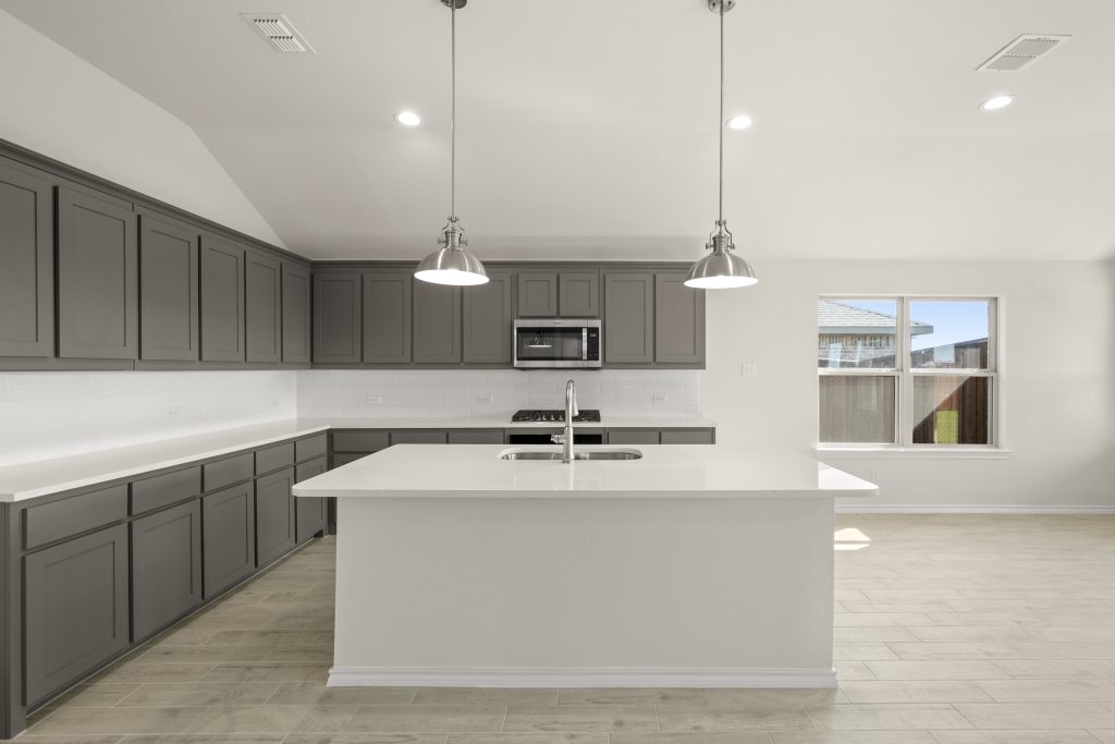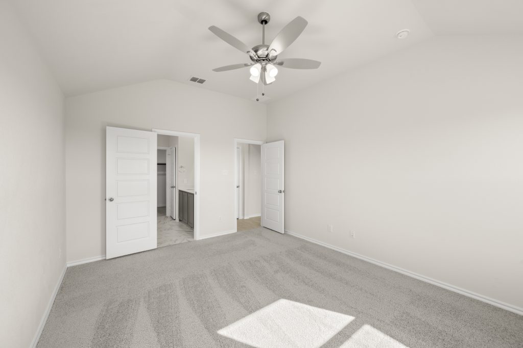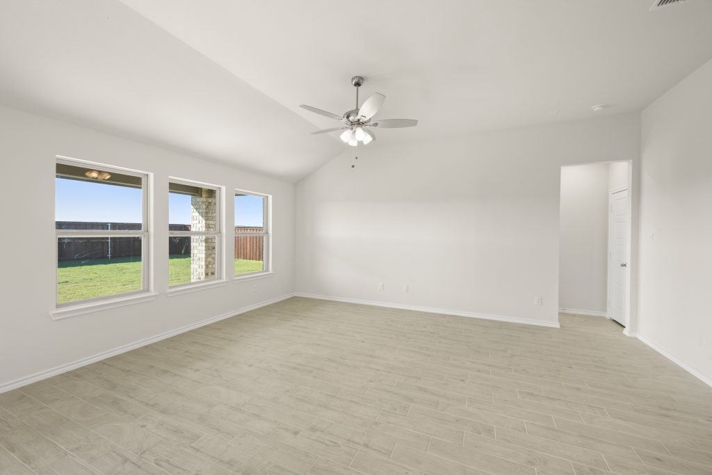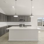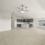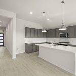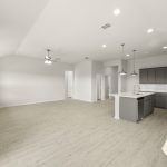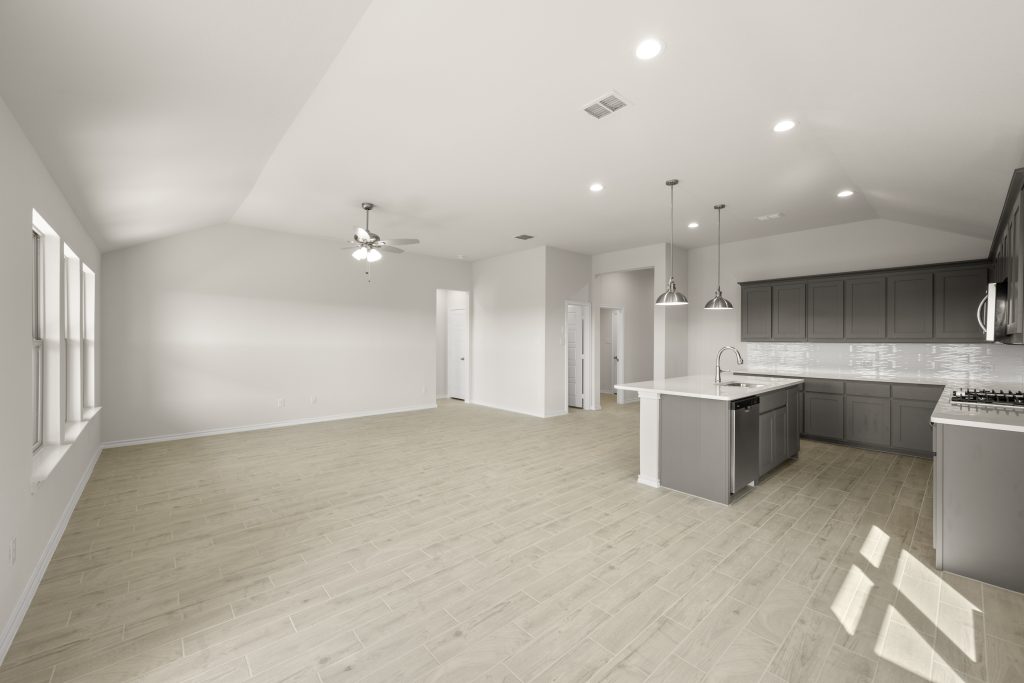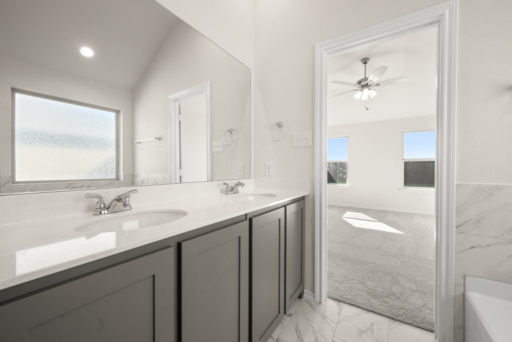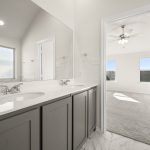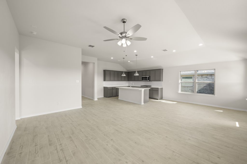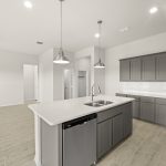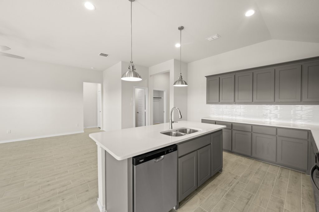 The Atlanta offers an open-concept layout, featuring a kitchen with a spacious walk-in pantry, which opens to the family room. This floorplan includes 3 bedrooms and 2 baths, including a spacious owner suite with dual vanity sinks and large walk-in closet.