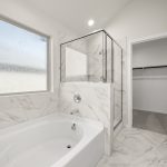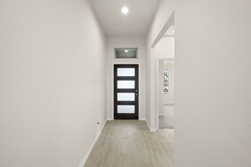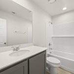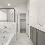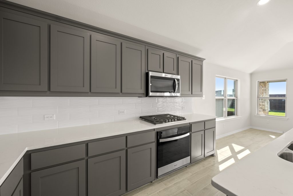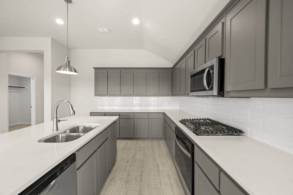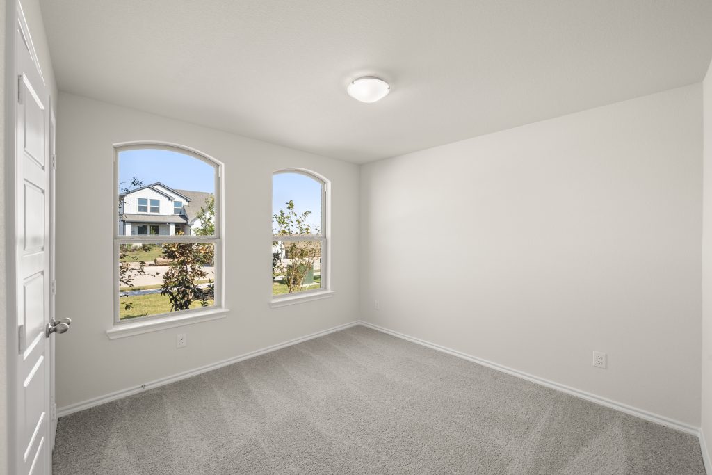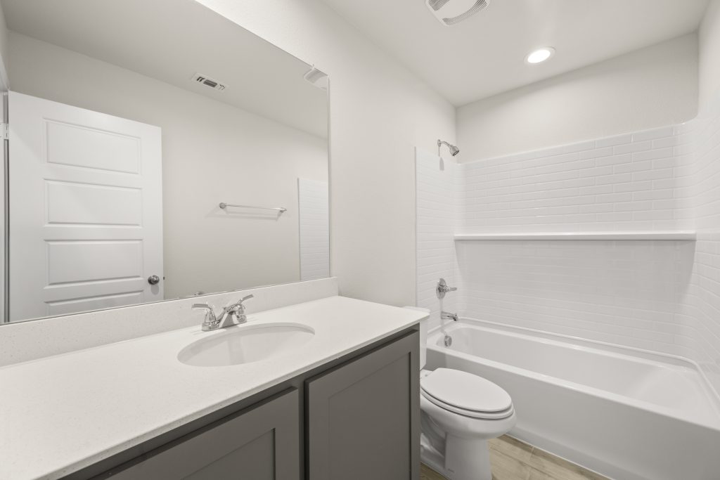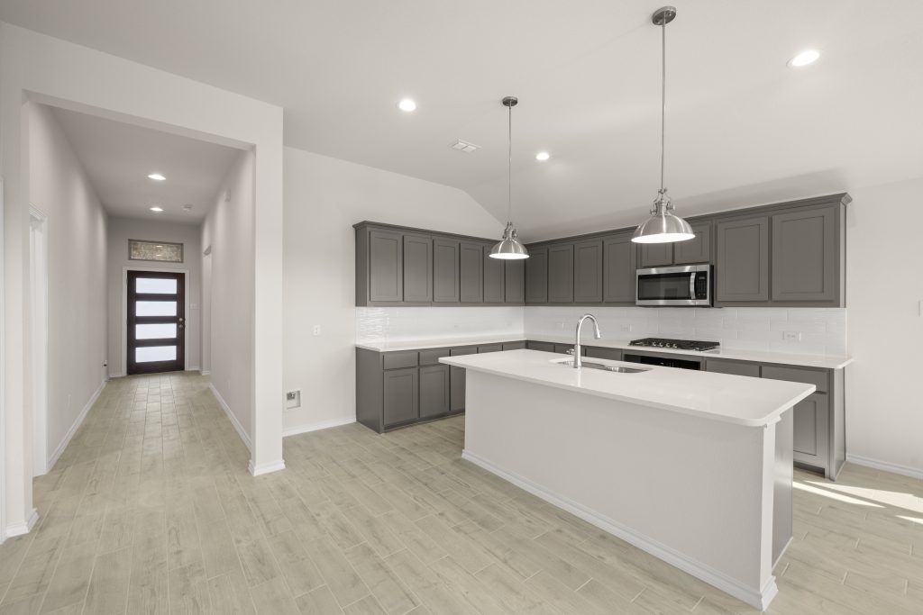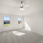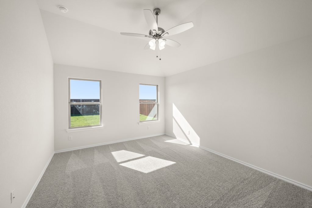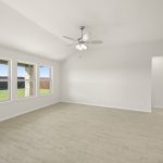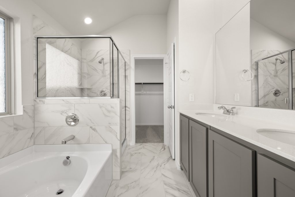The Atlanta offers an open-concept layout, featuring a kitchen with a spacious walk-in pantry, which opens to the family room. This floorplan includes 3 bedrooms and 2 baths, including a spacious owner suite with dual vanity sinks and large walk-in closet.