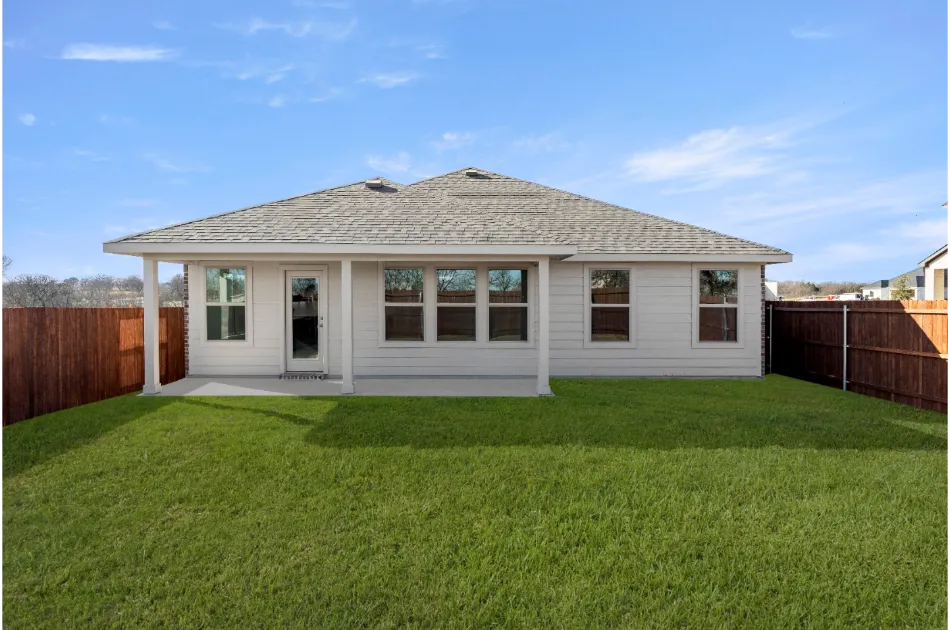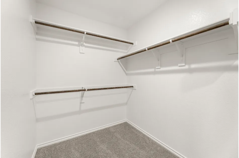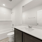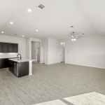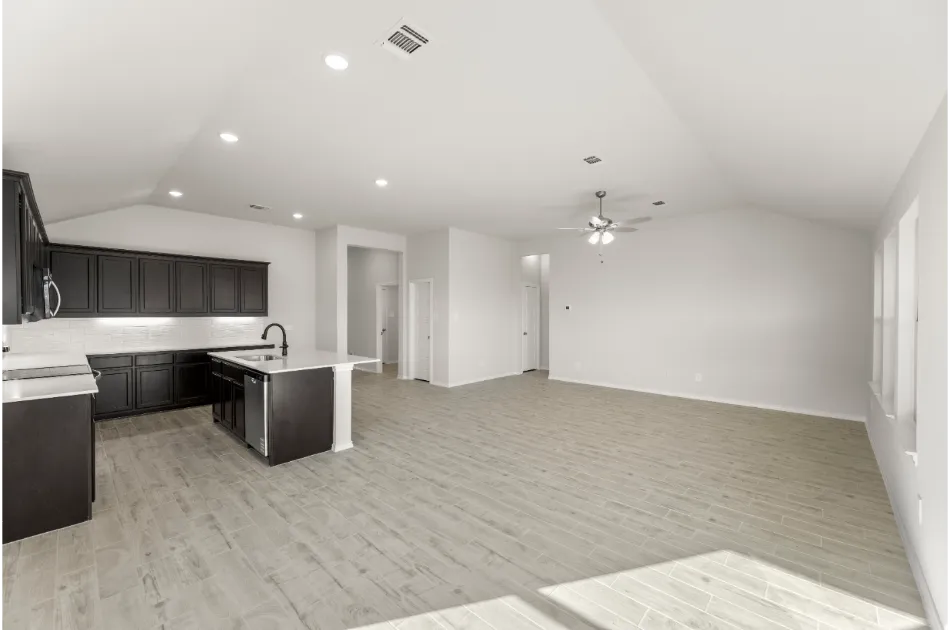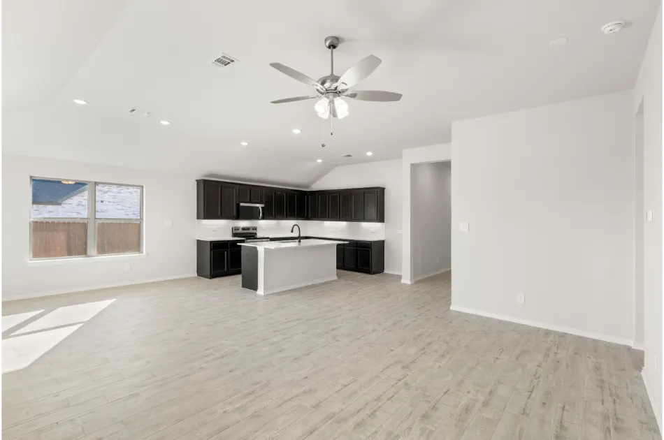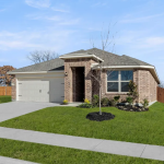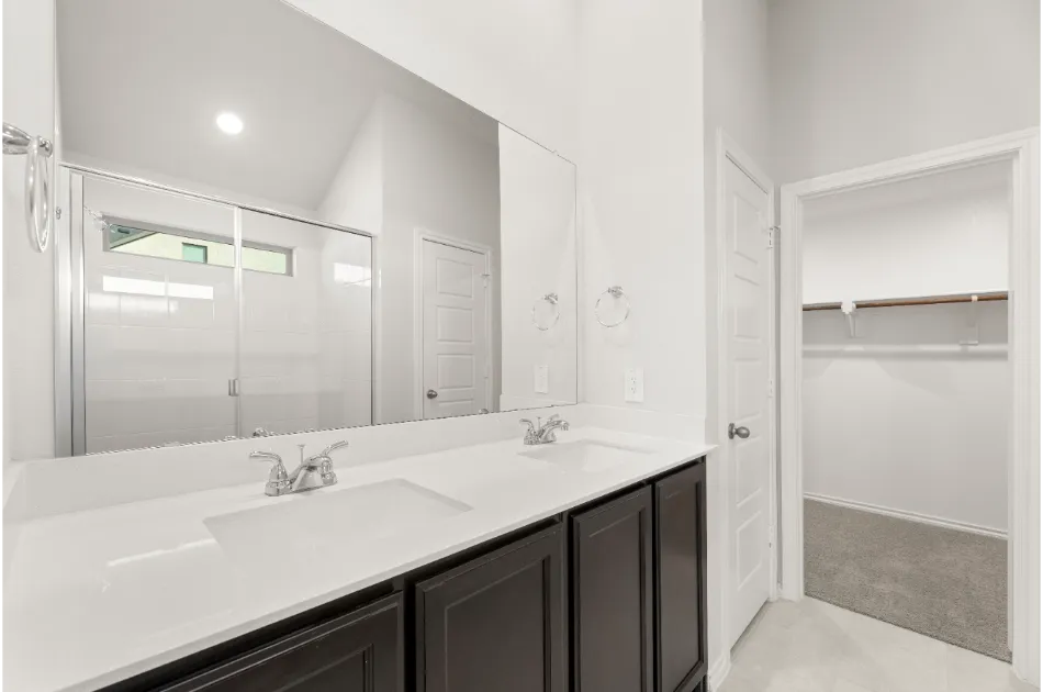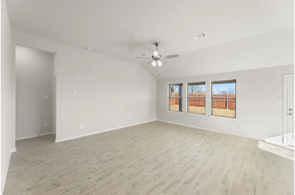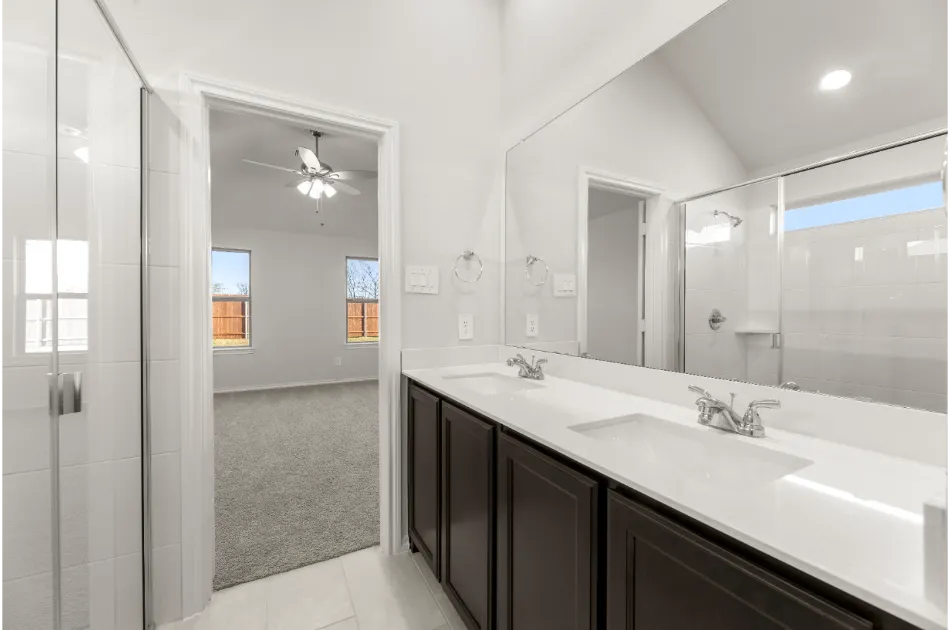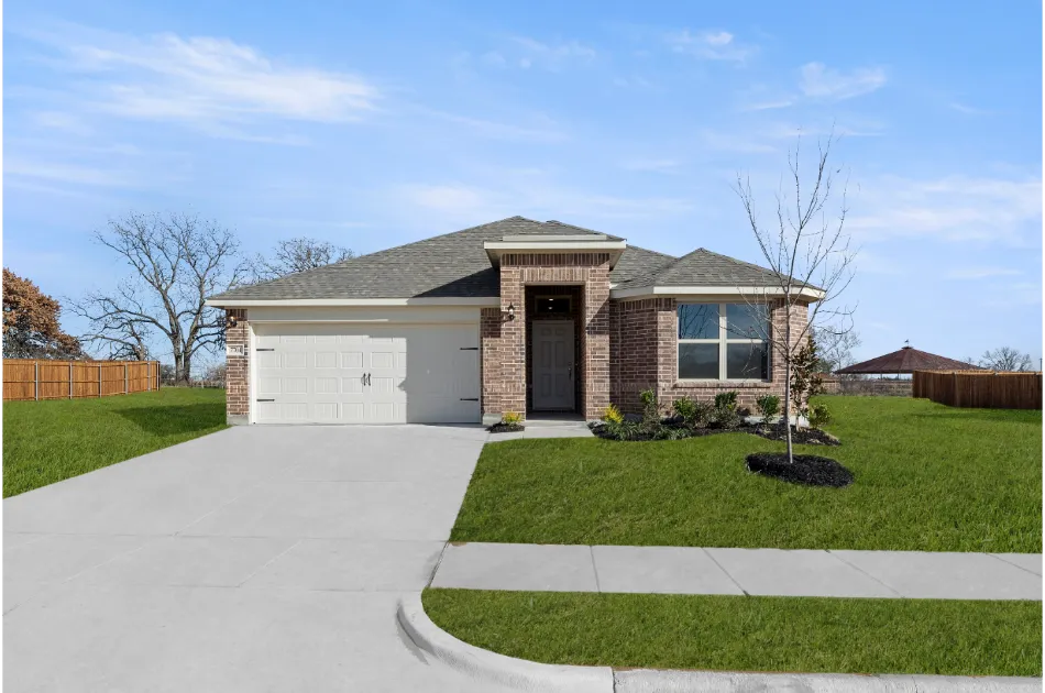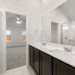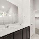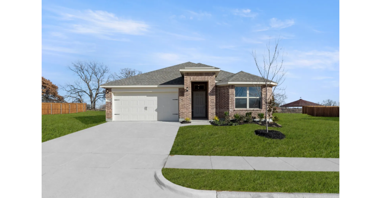The Atlanta offers an open-concept layout, featuring a kitchen with a spacious walk-in pantry, which opens to the family room. This floorplan includes 3 bedrooms and 2 baths, including a spacious owner suite with dual vanity sinks and large walk-in closet.